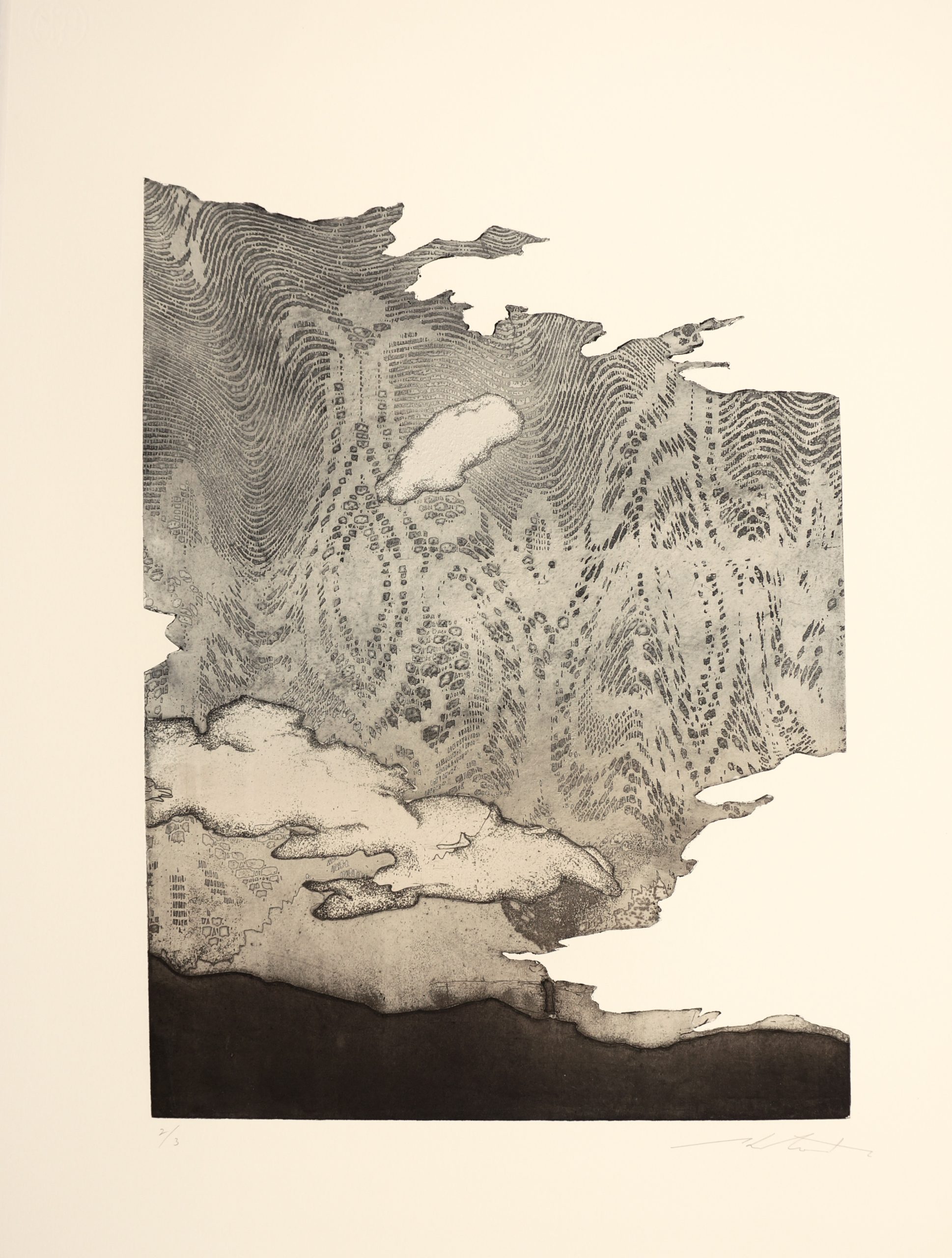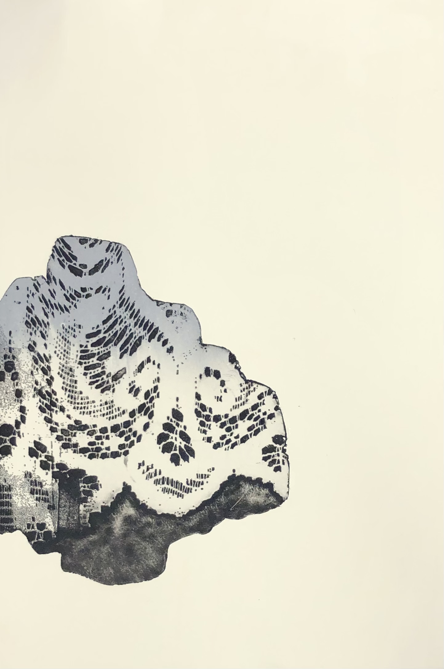 「何気ない こころに残る時間」をテーマに、銅版画(凹版画)を中心に、版画技法を用いて制作。レースなどをモチーフに「境界」として位置づけ、手前と奥の時間のズレを表現しています。それぞれの瞬間が独自の時間軸を持ち、時間が一様に進行せず、異なる時間日が共存している感覚。時間の流れの不均質性、時間と空間の関係性を問いながら、静かに世界を捉えたいと思い形にする事で視覚化しています。